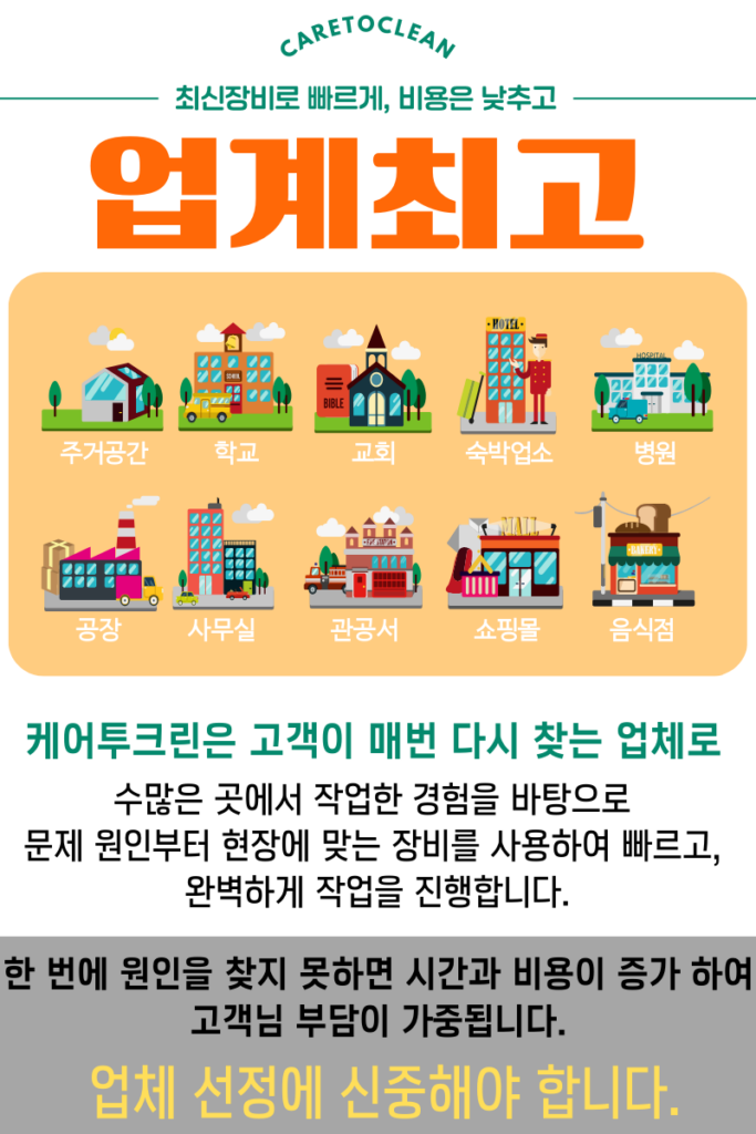 업체 선정이 가장 중요합니다. 케어투크린은 가정집 아파트, 빌라, 학교, 음식점, 교회, 호텔, 관공서, 학교, 유치원등